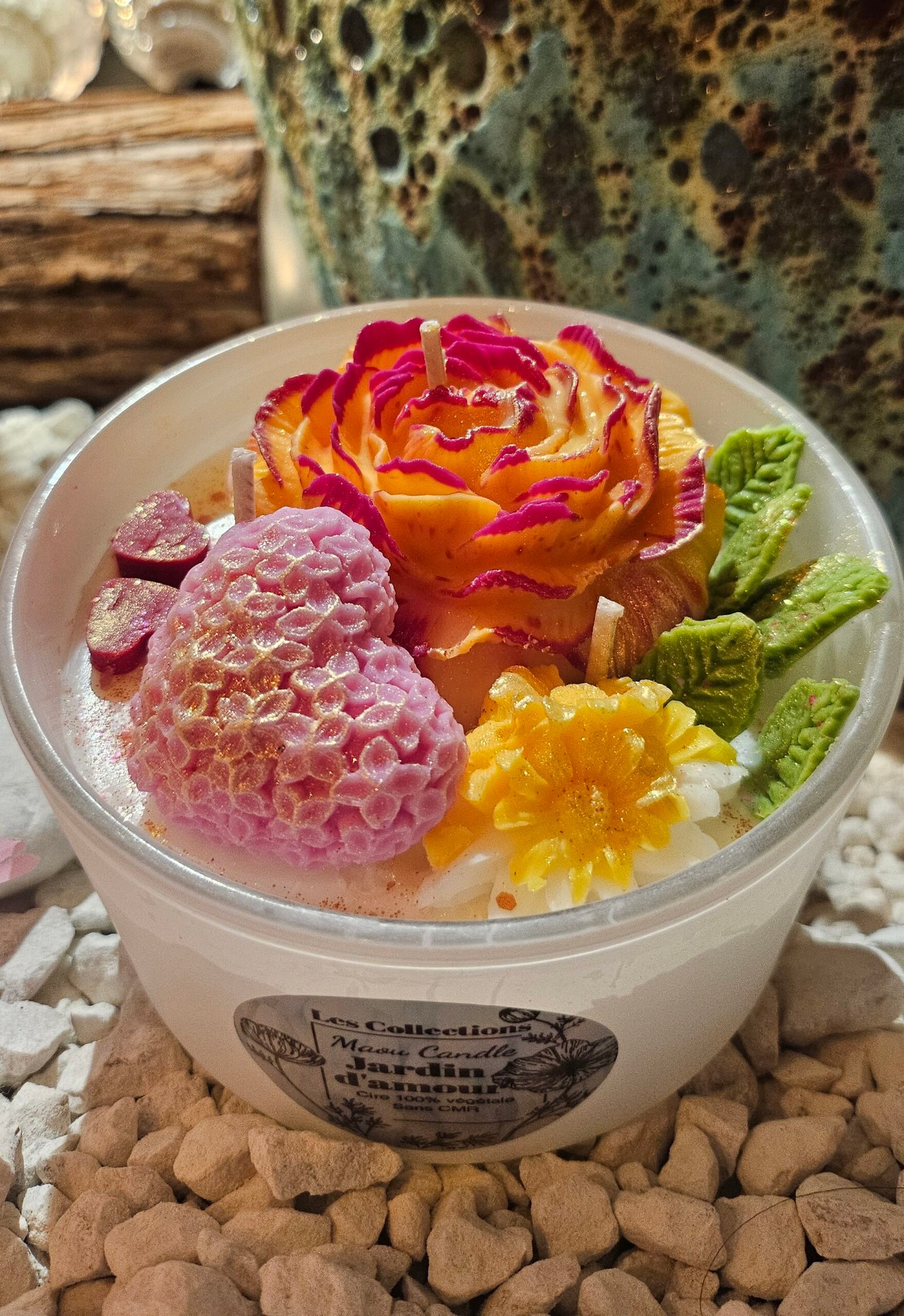 La bougie Jardin d’Amour est une création entièrement réalisée à la main dans notre atelier. Chaque élément qui la compose est minutieusement façonné un à un : les fleurs, les feuilles, les petits détails décoratifs… rien n’est moulé à la chaîne, tout est travaillé avec patience et passion.